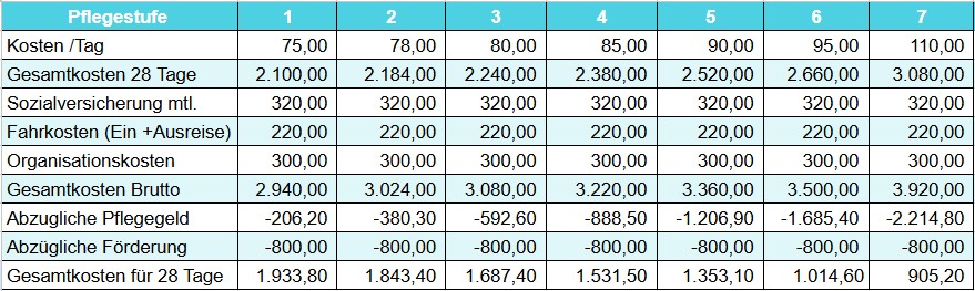 Die tatsächlich anfallenden Kosten ermitteln wir anhand des Pflegebedarfes (Pflegestufe bzw. Gesundheitszustand und eventuell zusätzlicher Wünsche) der pflegebedürftigen Person und nach der Art der Betreuung (Pflegerin oder Krankenschwester).